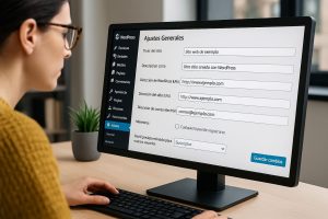 En esta sección defines el título del sitio, la descripción corta y la dirección de WordPress. Aunque parezca simple, estos datos son importantes. Un título claro ayuda a los motores de búsqueda a identificar tu web. Una descripción breve aunque no siempre visible en el frontal define el propósito del sitio.
